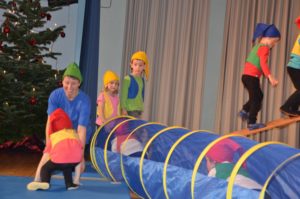 Danach gab es für die Gäste Einblick in den Turn-Vorbereitungskurs. Ab fünf Jahren erlernen die Kinder angeleitet von Julia Birk und ihrem Team Kopf, Arme, Beine und Bauch bewusst zu steuern und zu führen. Strecksprung, Vorwärtsrolle, Balancieren und koordinatives Gehen im Vierfüßlerstand gehören zur wöchentlichen Gymnastik der Jungturner, die am Sonntag ganz schick im Weihnachts-Wichtel-Kostüm auftraten.