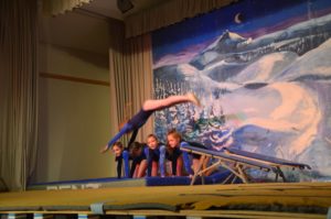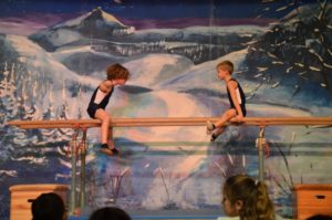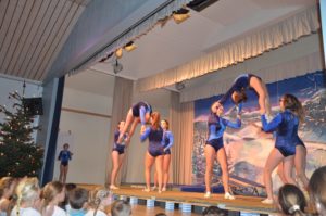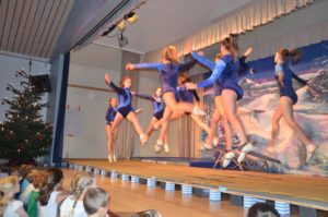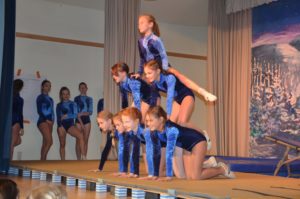 Die Turnklassen eins bis vier, die von fast 150 Turnschülerinnen und -schülern besucht werden, waren die nächsten Akteure auf der TV-Bühne. Jungen wie Mädchen zeigten an Bodenmatte, Balken oder am Barren Turnelemente, mit denen sie im abgelaufenen Jahr bei Wettkämpfen angetreten waren. Dazwischen hatten sie mit ihren Übungsleitern tänzerische, akrobatische und Clowns-Einlagen – sehr zur Unterhaltung des Publikums – parat.