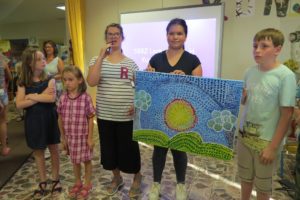 Die Künstlerin Heike Kalt widmet sich der Kunst der australischen Ureinwohner, dem Dot Painting. Hier werden Farben mit Stöckchen oder Wattestäben auf die Leinwand gebracht. Eine Schülerin der Gruppe sagte dazu: «Das ist viel Aufwand und man braucht viel Geduld«. Aber die farbenfrohen Bilder mit den gemusterten Motiven sind dafür auch sehr schön geworden.