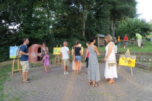Künstler Werner Bliss machte zum ersten Mal bei den Kunsttagen mit. Sein Projekt mit einigen Flüchtlingskindern beschrieb er so: Aus Zerstörtem soll etwas Neues entstehen. Dabei haben die Kinder eine Obstkiste mit einem Beil zerstört, aus dem Kleinholz kleine Bruchstücke genommen, mit Farbe bestrichen und eine Bildkomposition erstellt. »Man kann mit einfachen Mitteln Kunst gestalten« erklärte Werner Bliss diese Kunstform. Vor allem die körperliche Arbeit mit dem Beil war für die Kinder neu und interessant.