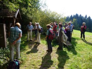 Kurz danach wurde an einer Sitzgruppe eine Pause zur Stärkung eingelegt. Bevor man auf der Breitreute, dem höchsten Punkt der Wanderung, herrliche Aussichten genießen konnte, führte die Route zum Zollhaus und anschließend entlang der ehemaligen Baden-Württembergischen Grenze, wovon alte Grenzsteine zeugen. Über einen ehemaligen Pilgerpfad, welcher mit Steinplatten belegt war in denen noch Wagenspuren erkennbar sind, ging es talwärts zur traditionellen Vesperstube Schwenkenhof.