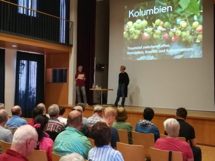 Während der Vortragspause stand die Referentin den interessierten Zuhörern für Fragen rund um ihre neue Heimat und das dortige Leben zur Verfügung. Des Weiteren berichtete sie über den zunehmenden Kaffeeanbau, über den anwachsenden Tourismus, dass Kolumbien der zweitgrößte Schnittblumenlieferant der Welt ist, und dass die exotischen Früchte, wie z. B. Mangos, eine immer wichtigere wirtschaftliche Rolle spielen. Mit landschaftlichen und kulturellen Bildern führte sie gekonnt durch den Abend. Manuela Bruder berichtete weiterhin über die Herstellung von Kokosnussöl, das sie auf natürliche Weise herstellt.