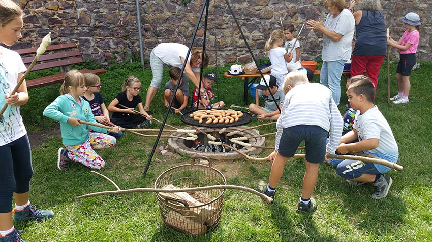 Nach Ritterspielen mit Armbrust und Holzschwert traten die Teilnehmer zum Empfang des Ritterschlags an. Die Siegesfeier fand an einem Lagerfeuer statt, um das sich Hans Witschel kümmerte. Martina Ringwald und Marlene Herrmann sorgten mit Stockbrot und Grillwurst für eine kräftige Stärkung. Barbara Martin las danach die Geschichte der Stadtmusikanten vor, welche die Räuber vertrieben haben.