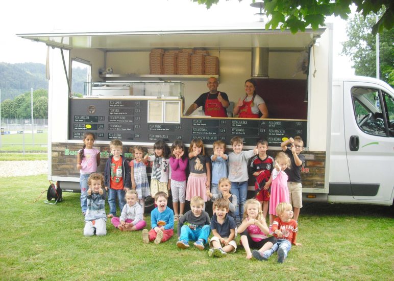 Der Kindergarten investierte die Spende der Narrenzunft in dieses besondere Erlebnis. Der Pizzawagen kam pünktlich zur Mittagszeit. Die Kinder konnten sich ihre eigene Pizza bestellen und abholen – und sich ganz erwachsen fühlen. Da hat der Kindergarten genau gewusst, wie er seinen Kleinen eine riesige Freude machen kann: Pizza zählt zu den Top-3-Lieblingsessen der Kinder, gleich nach Nudeln und Pommes.