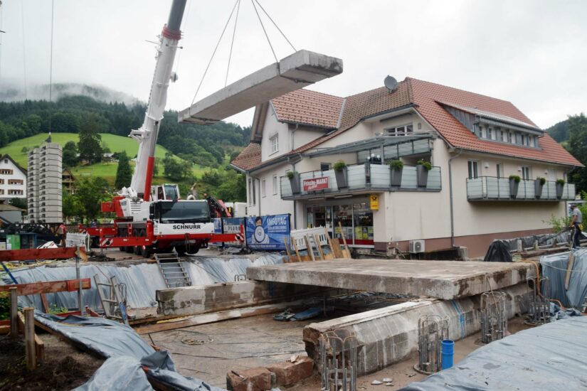 Der Abbruch einer Betonbrücke erfordert mehr Zeit, als Laien vermuten. Leitungen mussten verlegt und alle kleineren Brückenteile entfernt werden. Am Ende blieb der Betondeckel, der die Nordrach überspannt hat, übrig. Er wurde in fünf gleiche Teile gesägt. Ein mächtiger Kran der Firma Autokran Schnurr, Oberharmersbach, hob die einzelnen Brückenteile mit ca. 13 Tonnen Gewicht aus ihrem Lager und verlud sie auf einem Lastwagen mit Tieflader, der sie zum Parkplatz beim Sportplatz brachte. Dort werden sie weiter zerlegt.