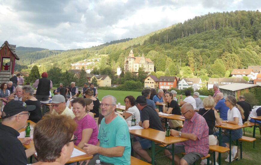 Froh über das nun endlich erfolgte Einsehen des Wettergottes zeigen sich auch Gertrud und Herbert Spitzmüller, die Betreiber des Hermehansenhofs. Sie haben die große Wiese vor ihrem Ferienhaus für das Platzkonzert zur Verfügung gestellt – von hier oben, auf halber Hanghöhe, hat man einen wundervollen Blick hinunter ins Dorf und weit hinein ins Tal. Auch der zum Hof gehörende Bewirtungswagen ist im Einsatz. Hier werden leckere Flammkuchen und Bratwürste gebrutzelt, nicht weniger willige Abnehmer finden die kühlen Getränke an diesem warmen Sommerabend.