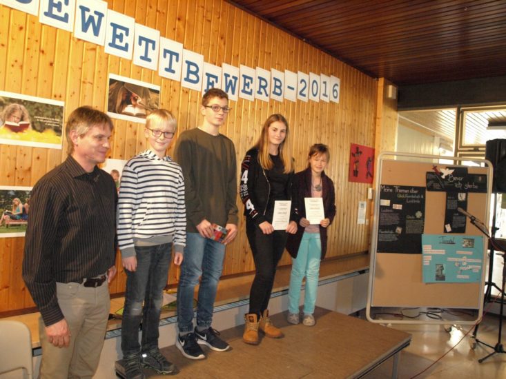 Sieger in der 3. Klasse wurde Sebastian Huber, der sein Lieblingsbuch »ET-Der Außerirdische« vorstellte. In der 4. Klasse setzte sich Lisanne Schlumberger durch, die einen Band aus der Reihe »Magic Girls« ausgewählt hatte. Siegerin in der Klassenstufe 7/8 wurde Lucie Breig mit der anspruchsvollen Lektüre »Das Tagebuch der Anne Frank«. Sven Huber aus der Abschlussklasse der Werkrealschule stellte außer Konkurrenz seine Literaturarbeit zum Roman »Ohrensausen« von Jochen Till vor.