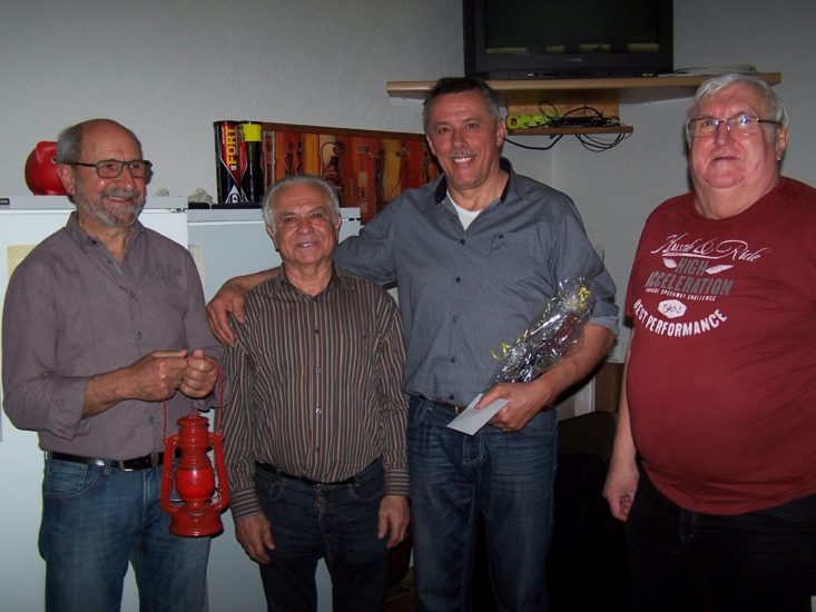 Sieger und Verlierer des Hunderte-Turniers. Ludwig Brucher mit der roten Laterne (von links), Otto Lehmann (2. Platz), Sieger ­Helmut Lehmann und Cölestin Kornmayer (3. Platz.) Foto: Hermann Kornmayer