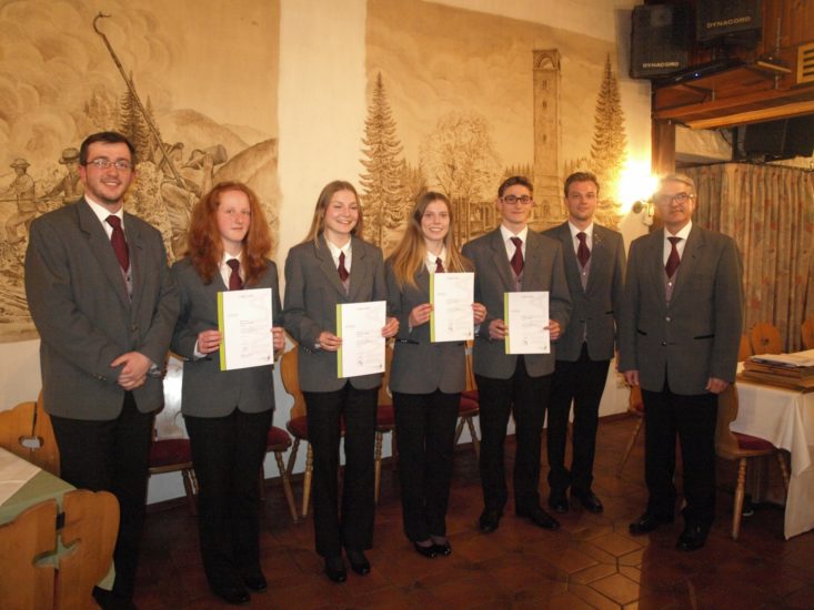 Eine intensive Probenarbeit und viel Begeisterung für das Musizieren waren und sind auch weiterhin unabdingbare Voraussetzungen für den hohen Ausbildungsstand. Sophia Huber, Roberta Lay, Corinna Lehmann und Aaron Nock haben im letzten Jahr erfolgreich die Prüfung zum silbernen Leistungsabzeichen für Jungmusiker abgelegt. Vorstandsmitglied Victor Lay überreichte ihnen die Urkunden. Für den besten Probenbesuch wurde Gero Lehmann ausgezeichnet, der auch für die Hörner den Registerpreis entgegennehmen konnte. Auch Claus Jilg, Vorstandsmitglied im Hauptverein, freute sich über die gute Bilanz der Bläserjugend (»Ihr seid unsere Zukunft«) und dankte auch im Namen aller Vereinsmitglieder für die gute Arbeit.