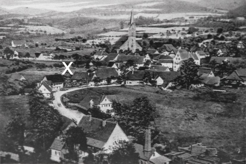 Das Panoramabild von der »Katzenhalde« aus zeigt, wo sich eine Gasse zwischen den Häusern im Unterdorf öffnet (X) und auf welcher Trasse die zu erbauende Bahnlinie später tatsächlich gebaut wurde.