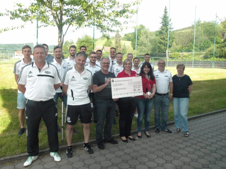 Auch die Sparkasse Haslach-Zell freute sich über die Meisterschaft und den Aufstieg des SV Oberharmersbach in die Landesliga. Kurz vor der Abfahrt zum letzten Saisonspiel am Mittwochabend in Rust gratulierten Geschäftsstellenleiterin Sandra Hoferer und ihre Kollegin Sandra Brucher-Hug der Mannschaft und der Vereinsführung zu dem Erfolg und überreichten symbolisch einen Scheck in Höhe von 500 Euro. Mit diesem Betrag würdigte die Sparkasse nicht nur die Meisterschaft in der Bezirksliga, sondern auch die gute Jugendarbeit im Verein als Grundlage für die sportlichen Erfolge der aktiven Mannschaften. Das Engagement für den regionalen Sport, sowohl im Breiten – wie auch im Spitzensport, gehört seit jeher zum Selbstverständnis der Sparkasse Haslach-Zell. Damit will das Institut den sozialen Zusammenhalt und die Lebensqualität in ihrem Geschäftsgebiet stärken. SVO-Vorsitzender Helmut Killig dankte für die großzügige Geste und die Spieler stimmten zum Dank den Tusch »España olé« an.