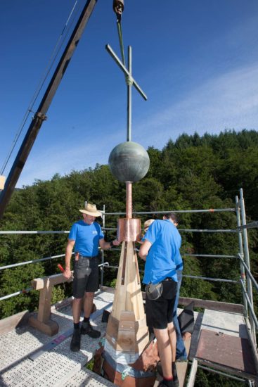 Auf nahezu 30 Meter musste Gerd Rombach den Fahrzeugkran der Firma Rombach ausfahren. Langsam schwebte die Last auf Turmhöhe, Schrauben gaben Zierkugel und Kreuz den erforderlichen Halt. Damit hat der Turm der Zuwälder »Maria-Hilf-Kapelle« wieder seine Höhe von knapp über 30 Meter erreicht. Mit den Blechnerarbeiten findet die Sanierung des Turmhelms demnächst ihren Abschluss.