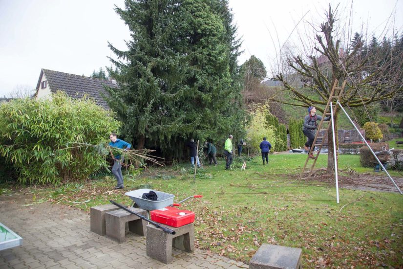 Unterstützt von Fachkräften für Forstarbeiten und Baumschnitt galt beim ersten Arbeitseinsatz die Aufmerksamkeit vorab den Grünanlagen. Obwohl das Wetter keineswegs zum Baden einlud, schienen die Mitglieder des Fördervereins schon lange mit den Hufen gescharrt zu haben. Der Eifer war un gebremst: Hecken wurden zurechtgestutzt, Laub zusammengerecht, Äste der Bäume zurückgeschnitten. Fleißige Hände sammelten den Grünschnitt ein. »Besenrein« wurden die Pflasterflächen zurückgelassen, als der Arbeitseinsatz beendet und der nächste Einsatztermin geklärt war.