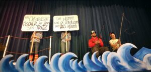 Die Jungfernfahrt entlang der Gestaden Oberharmersbachs gerät selbstredend zu einer alles aufs Korn nehmenden Sightseeing-Tour. Ob Industriegebiet – “Unser Penny, hochmodern, der leuchtet am Himmel, wie ein Stern“ – oder das neue Rathaus oder die 13 neuen Bauplätze beispielsweise: In schönster Schnitzelbankmanier kriegt alles sein Fett weg. Dramatisch allerdings wird es beim Auftauchen von Schiffbrüchigen, die um Wasser bitten. „Und so was in so einem reichen Ort. Traurig…“, sinniert Kapitän K. „Des ware e paar Nordracher“, pflichtet man ihm bei, „traurig, gell?“