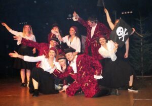 Zwischendurch wird mal vom Matrosenballett (das einen angriffslustigen Hai zerfleddert) und mal vom Publikum das Tanzbein geschwungen. Woraufhin es weitergeht mit dem vermeintlichen „Ballermann von Oberharmersbach“, einem Feuerwehralarm wegen eines Bierlagerbrandes, einer misslungenen Schiffstaufe, einem durchtrainierten Baywatch-Star (der eine hübschbeinig strampelnde Helene Fischer aus den Fluten rettet), einem blinden Passagier (der klammheimlich von der Bühne robbt), einem glücklichen Fitness-Felix und einigem mehr. Enden kann das alles natürlich nur: in einem Überfall durch „ALPIRaten“, die das Tanzbein sehr bald gleichfalls juckt.
