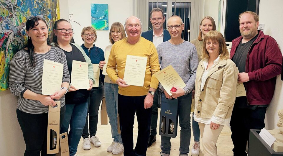 Von den elf geehrten Spendern waren acht am Montag anwesend: Stephanie Kiwitt, Lorena Schmieder und Natha-lie Bischler (je 10 Spenden), Tobias und Alexandra Kempf sowie Katharina Kubasek (je 25 Spenden). Ulrich Bleier und Bernhard Schmieder wurden für ihre hundertste Blutspende ausgezeichnet.
