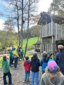 Am Samstag und Sonntag standen dann die offenen Angebote gemeinsam mit dem Wildnis-coach auf dem Programm. Themenschwerpunkt der Vormittage war die Orientierung im Wald mit Karte und Kompass. „Wenn ihr es schafft, dieses Ei innerhalb von 40 Minuten so in Naturmaterialien zu verpacken, dass ich es anschließend von diesem Spielturm abstürzen lassen kann und es dabei nicht kaputt geht“, motivierte Tobi die Kinder, die mit ihren Anmeldungen dafür gesorgt hatten, dass die Veranstaltungen ausgebucht waren, „dann dürft ihr, bevor wir selbst eine Schnitzeljagd legen, noch mit echten Sportbögen das Bogenschießen ausprobieren“. Die Begeisterung war groß, die Suche nach geeigneten Blättern und Sträuchern begann, es wurde verpackt und gepolstert und schlussendlich mit großer Spannung dabei zugesehen, wie das Ei samt Hülle vom Spielturm fiel. Die Erleichterung über den Erfolg war spürbar.