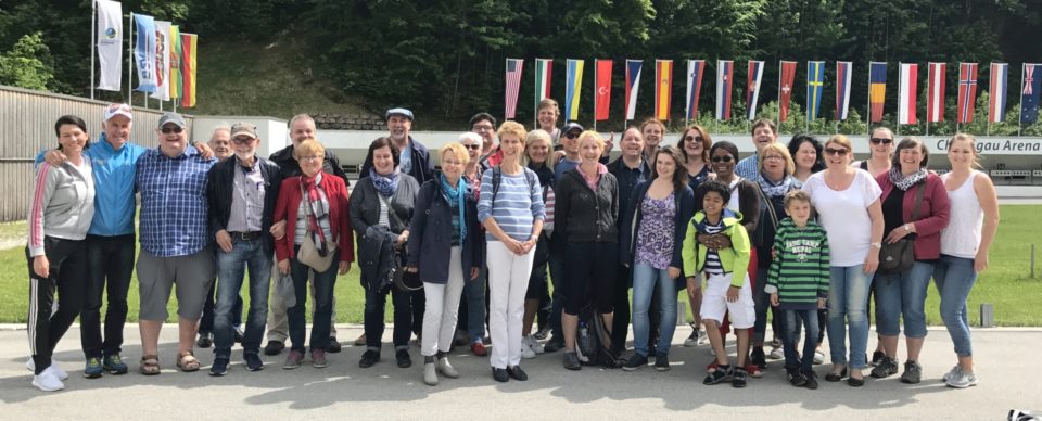 Foto: »Joy&Fun«-ChorusFür die Hinfahrt hatte Thomas Dreher einen Stop beim Biathlonzentrum in Ruhpolding vorgeschlagen. Fritz Fischer, mehrfacher Olympiasieger und Weltmeister zwischen 1983 und 1993, begrüßte den Chor und informierte ihn über diesen anspruchsvollen Sport. Unter Anleitung hatte jeder liegend zehn Schuss auf fünf Scheiben mit einem Biathlongewehr frei. Das Ergebnis: Der Chor verfügt über gute Schützen und Fritz Fischer kann auch singen, wie sich beim »Ständerle« zeigte.