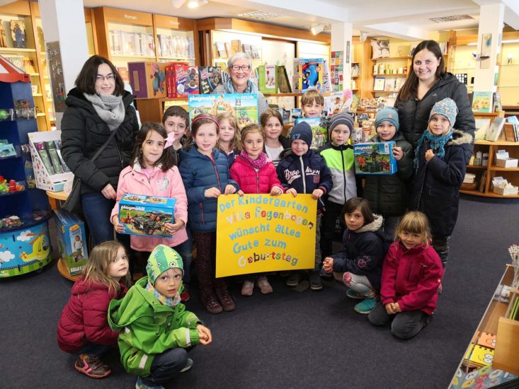 Die Kinder und Erzieherinnen des Kindergartens Villa Regenbogen gratulieren der Buchhandlung Rund ums Leben Kopf herzlich zum 10-jährigen Jubiläum.