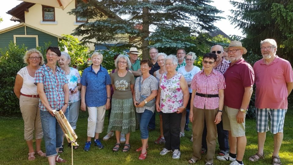 Dort war schon alles für den Einfall der hungrigen und durstigen Schar vorbereitet. Klaus und Sabine nahm sie herzlich in Empfang, und im lauschigen Garten wartete schon ein von den Gastgebern liebevoll vorbereiteter, blumengeschmückter Tisch. Eine wunderbare Erdbeerbowle weckte sofort die Lebensgeister und ölte die Stimmen der Wanderer, so dass Klaus nun das Ständchen zu seinem schon einige Zeit zurückliegenden 70. Geburtstag gebracht werden konnte. Gut gelaunt präsentierte der Chor einige ausgewählte Lieder und brachte damit auch gleichzeitig seinen Dank für die heutige Einladung zum Ausdruck.