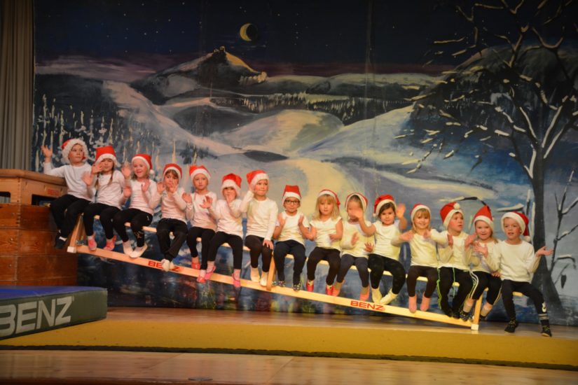 Nach der Begrüßung gehörte die Bühne den Kindern. Kleine »Turnmäuse« zeigten ihre ersten Übungen. Danach folgten die Gym-Kids als muntere Nikolause. Mutig balancierten sie über die Schrägbank und sprangen vom Kasten. Die Mädchen der Klassen 1 bis 3 Geräteturnen präsentierten eine Bodenkür und zeigten, dass aus ihnen schon gute Turnerinnen geworden sind.