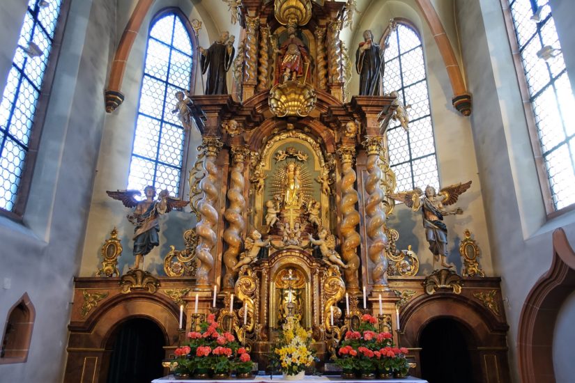 Foto: Bruder Berthold OehlerFestlich geschmückt ist am höchsten Festtag der Hochaltar im Vorraum der Wallfahrtskirche. Er wurde im Baustil der Gotik (1250 – 1530) errichtet. Im Mittelpunkt des Altaraufbaues befindet sich das Gnadenbild, das Maria sitzend mit Jesus auf dem Schoß zeigt. In ihrer rechten Hand trägt Maria das Zepter als Herrscherin, während Jesus als Königssohn den Erdball in seiner Hand hält und ihn segnet. Das aus Lindenholz geschnitzte Gnadenbild ist noch älter als die Kirche selbst. Es stammt aus der Zeit der Romanik (950 – 1200), denn in der nachfolgenden Zeit der Gotik wurde die Gottesmutter Maria immer stehend dargestellt.