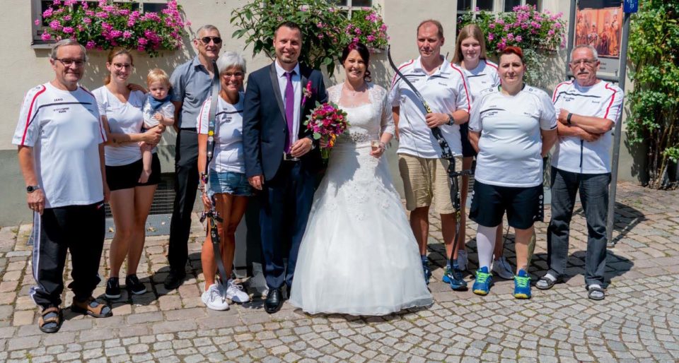 Ein Tag wie es im Buche steht, schöner könnte ein Tag wie dieser nicht sein: Sonne satt und gut gelaunte Hochzeitsgäste machten den Tag perfekt. Als das frisch getraute Paar aus dem Trauzimmer vom Storchenturm-Museum heraus trat, überraschten die Zeller Bogenschützen*innen das junge Paar mit einem Bogenspalier, dieser führte sie zu einem aufgemalten Herz auf einem Leintuch mit Amor-Pfeil.