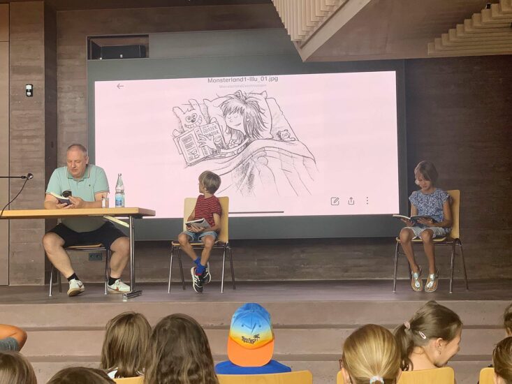 Am Donnerstag war es dann auch für alle Drittklässler soweit: Manfred Theisen, der Autor des Kinderbuchs »Monsterland – Ein Geist auf der Flucht«, informierte in einem lebhaften Vortrag über die Entstehung des Buchs, gab eine kurze Einführung in die Personenkonstellation der Handlung und zeigte eine Zeichnung von dem Freizeitpark »Monsterland« des Illustrators Frederic Bertrand. Im weiteren Verlauf der Veranstaltung durften zwei freiwillige Leser aus der dritten Klasse eine Leserolle übernehmen, sodass die Lesung weiter an Lebhaftigkeit gewann.