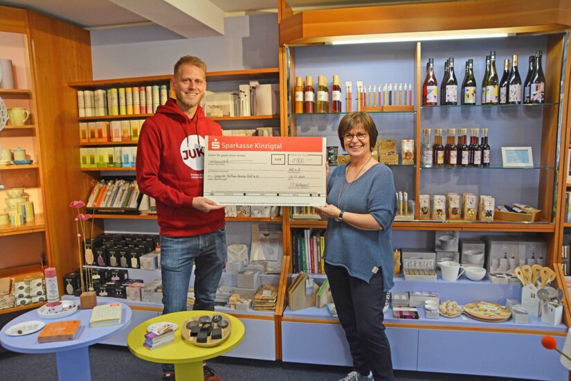 Mit einem tollen Fest hat die Buchhandlung Kopf das 100-jährige Firmenjubiläum gefeiert. Nun findet die Feier einen schönen Nachklang. Inhaberin Petra Kühnpast hat an den Vorsitzenden Sebastian Mayer eine Jubiläumsspende in Höhe von 1000 Euro übergeben.
