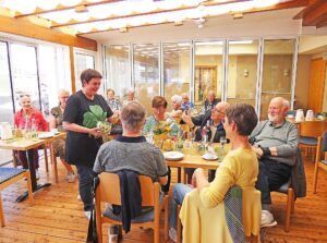 Nach gemeinsamem Kaffeetrinken und Kuchenessen sorgte Ehrengast Michaela Neuberger für einen unterhaltsamen Abschluss der Versammlung – diesmal nicht als Bäuerin Zetzel, sondern als Trägerin eines T-Shirts mit riesigem Kleeblatt. Das Märchen vom großen und kleinen Glück las sie vor. Mit der AWO-tauglichen Botschaft, nicht erfolglos dem großen Glück hinterherzujagen, sondern sich stattdessen tagtäglich der kleinen Glücksmomente bewusst zu werden.