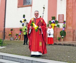 „Der Himmel hat ein Einsehen“, sagte Pfarrer Bonaventura Gerner in seiner Begrüßung auf dem Kirchplatz. Er erinnerte an die Erzählung aus der Bibel, was bei Einzug von Jesus nach Jerusalem passiert ist. Die Menschen nahmen grüne Zweige in die Hand, stellten sie an die Straße und jubelten ihm zu. „Wir wollen es ihm gleichtun“, erklärte Pfarrer Gerner. „Jerusalem ist auch unsere Stadt, unsere Gemeinde. Jesus kommt auch zu uns.“ Er segnete die großen Palmen an der Kirchenwand, die Palmstöcke der Kommunionkinder und die Palmzweige in den Händen der Gemeindemitglieder und erklärte abschließend, dass die Palmzweige ein Zeichen der Hoffnung und Freude sind.