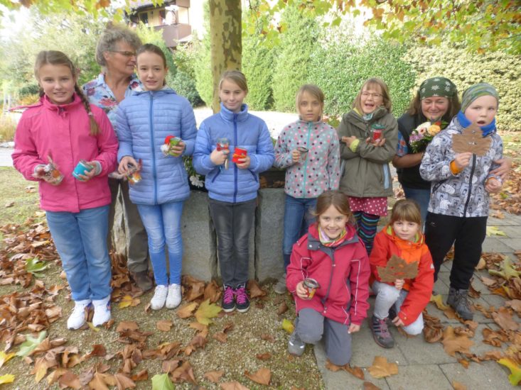 Die Betreuerinnen hatten schon allerhand Materialien aus der herbstlichen Natur vorbereitet: bunte Herbstblätter, kleine von Ästen gesägte Holzscheiben, Draht, Schnur, bunter Filz und viele andere Werkstoffe. Der Renner waren kleine Einmachgläser, aus denen bunte Kerzenlichter entstanden.