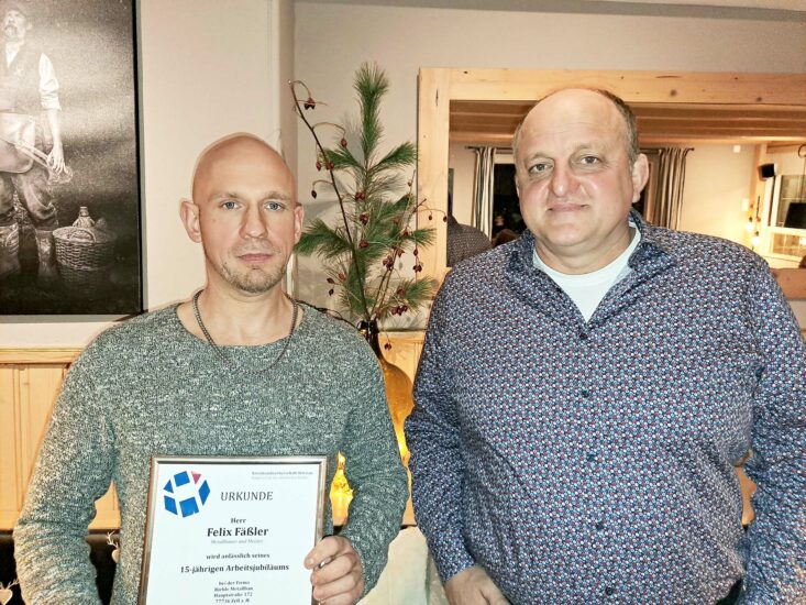 Fäßler sei eine große Stütze für die Firma Riehle Metallbau, würdigte der Chef seinen Mitarbeiter und überreichte eine Urkunde sowie ein Präsent.