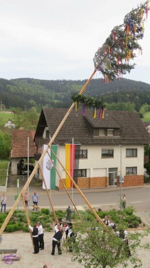 Das Aufstellen des Mai baumes erfolgte nach und nach mit den großen Staken, die am Dienstagabend von elf Zimmermännern fachmännisch den Baum in die Höhe schoben. Unter den Beifall der Zuschauer hatte der Baum bald seine aufrechte Position erreicht. Die Menge applaudierte dem Handwerkerteam und die Musik- kapelle spielte dazu das „Badnerlied“ – so sehen Traditionen aus.