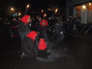 Im Halbdunkeln und im Schein der Fackeln wirkten Hexen, Teufel und Tiermasken noch etwas gruseliger als bei Tageslicht. Auf der Ehrentribüne stellte Zunftrat Joachim Albrecht die einzelnen Gruppen, vor und begrüßte sie mit ihrem speziellen Fasentruf. Nach dem Umzug wurde das Narrendorf bis weit nach Mitternacht zur Partyzone, in dem es stellenweise kein Durchkommen mehr gab.