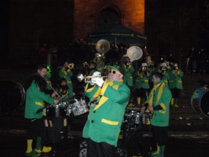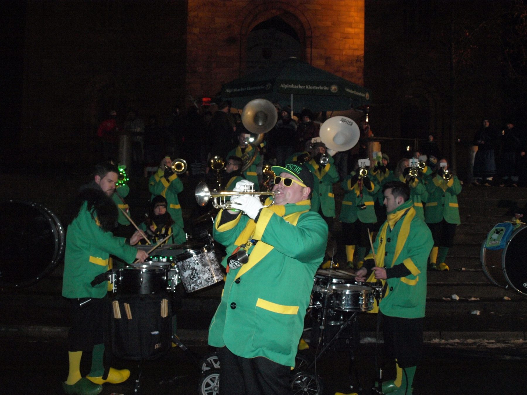 Herrschten tagsüber bei Sonnenschein noch angenehme Temperaturen, war es nun empfindlich kalt geworden. Doch der Stimmung unter dem närrischen Volk tat dies keinen Abbruch. In den Zelten und Verkaufsbuden hatten die Mitglieder der örtlichen Vereine alle Hände voll zu tun, um die Gäste mit Speisen und Getränken zu versorgen. Musik lag überall in der Luft. Aus den Boxen wummerten die Bässe der Disco-Hits, auf der Kirchentreppe gaben Guggenmusiker ein Freiluftkonzert. Ein interessanter Musik-Mix, der einfach zum Flair einer Fasent gehört.