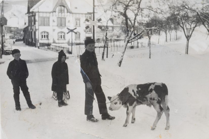 Lösung: Das Bild stammt wurde im Dezember 1939 aufgenommen. Es zeigt Bernhard Huber vom »Rüttigut« am Bahnübergang bei der Bäckerei Läufer (Cafè König). Am linken Bildrand ist das Wegkreuz (1985/200 vom Historischen Verein restauriert)bei der Metzgerei Lehmann zu sehen (»’s Metzgers Kriz«) – unschwer zu erraten, wohin der weitere Weg des Kälbchens führte…