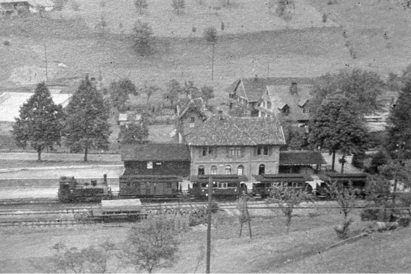 Lösung: Unser Bild zeigt den Riersbacher Bahnhof im Jahre 1939 (vom »Friedli-Buckel« aus gesehen). Die Datierung ist deswegen möglich, weil im Hintergrund am linken Bildrand die Baustelle des Schwimmbades zu sehen ist. Dort wurde 1939 mit Erweiterungsarbeiten begonnen.