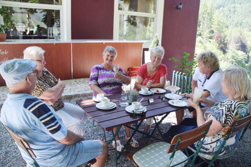 Bei strahlendem Sonnenschein fuhren die Senioren zunächst auf das Schloss Hornberg, wo sie eine Kaffeepause auf der idyllisch gelegenen Freiterrasse einlegten. Fast wäre danach die Weiterfahrt nach Furtwangen gescheitert. Denn an der Freizeitanlage unterhalb des Schlosses versperrte ein im Kurvenbereich abgestellter PKW dem Bus den Weg. Erst nach einer halben Stunde kam die Besitzerin und machte den Weg frei.