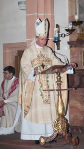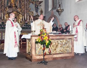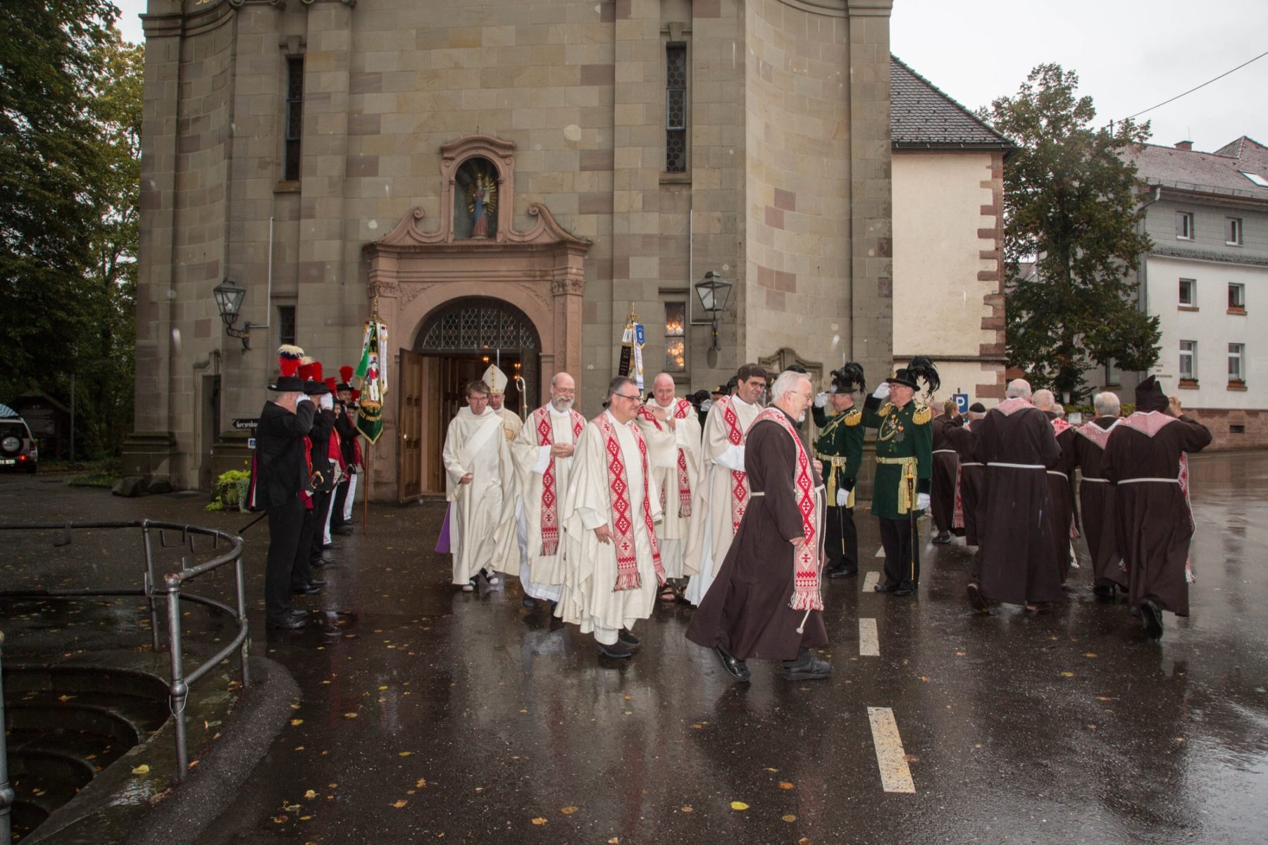 Das feierliche Hochamt, zu dem neben den Gläubigen der Zeller Bürgermeister Günter Pfundstein und der Unterharmersbacher Ortsvorsteher Ludwig Schütze sowie der Landtagsabgeordnete Volker Schebesta begrüßt wurden, zelebrierte der Freiburger Weihbischof Dr. Peter Birkhofer mit dem Provinzialer der Kapuziner Pater Christophorus Goedereis und dem Zeller Guardian Bruder Markus Thüer sowie Bruder Pirmin Heppner. Während vor den Seitenaltären die Abordnungen der Bürgerwehren ihre Plätz eingenommen hatten, feierten Kapuziner des Zeller Konvents und Mitbrüder aus anderen Klöstern zusammen mit Dekan Matthias Bürkle und Pfarrer Bonaventura Gerner den Gottesdienst im Chor mit.