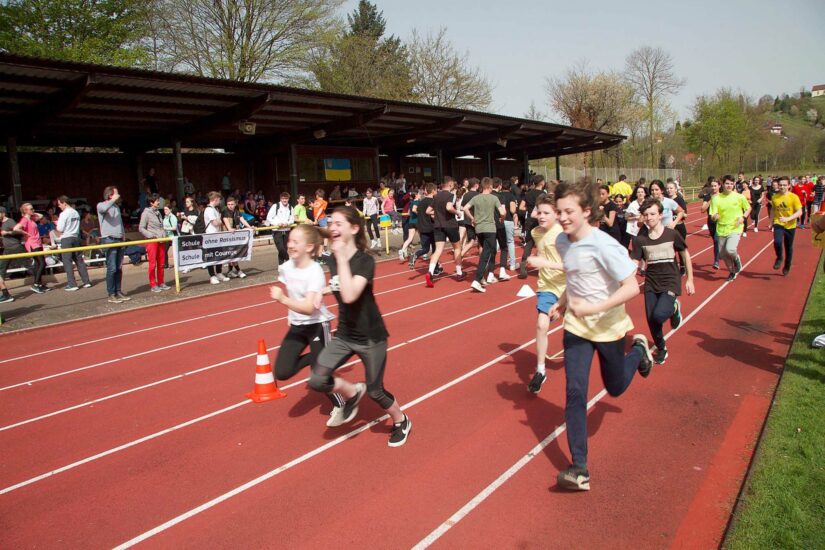 Füße donnerten über die Tartanbahn, die Sonne schien heiß vom Himmel. Trotz der hohen Temperaturen blieben alle hoch motiviert. Der Himmel strahlte blau, dazu schien die Sonne: Diese Farben, die auch die ukrainische Flagge bilden, fanden sich als Solidaritätsbekundung in der Kleidung vieler Schülerinnen und Schüler wieder.