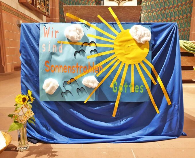 Den Auftakt bildete der Eröffnungsgottesdienst am 10. Oktober 2025 in der St. Gallus Kirche Oberharmersbach. Dieser wurde vom Erstkommunion-Team Mathilde Zimmermann, Tanja, Nicole, Martina und Kathrin Lehmann und den letztjährigen Kommunionkindern abwechslungsreich gestaltet. Ein passend zum Motto entworfenes Willkommensplakat schmückte die Kirche. Neben Rollenspiel und Fürbitten war der besondere Höhepunkt die Vorstellung des diesjährigen Liedes – analog dem Motto: „Wir sind Sonnenstrahlen Gottes“.