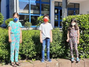 Die Grundschüler Hanna, Andreas und Lara tragen sie schon! Die bunten Schutzmasken, spendiert vom Förderverein der Grundschule Biberach.