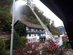 Feuerwehr Nordrach und Drehleiter der Feuerwehr Zell bei der Flüchtlingsunterkunft im ehemaligen Morada-Hotel im Einsatz.