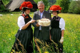 Gastronom Roland Dieterle zusammen mit zwei Gutacher Trachtenträgerinnen vor den Vogtsbauernhöfen. Mit dem Landgasthof zum Museum und einem Schwarzwaldladen hat Dieterle seine Laufbahn als Gastgeber und Impulsgeber für den Schwarzwald-Tourismus begonnen.
