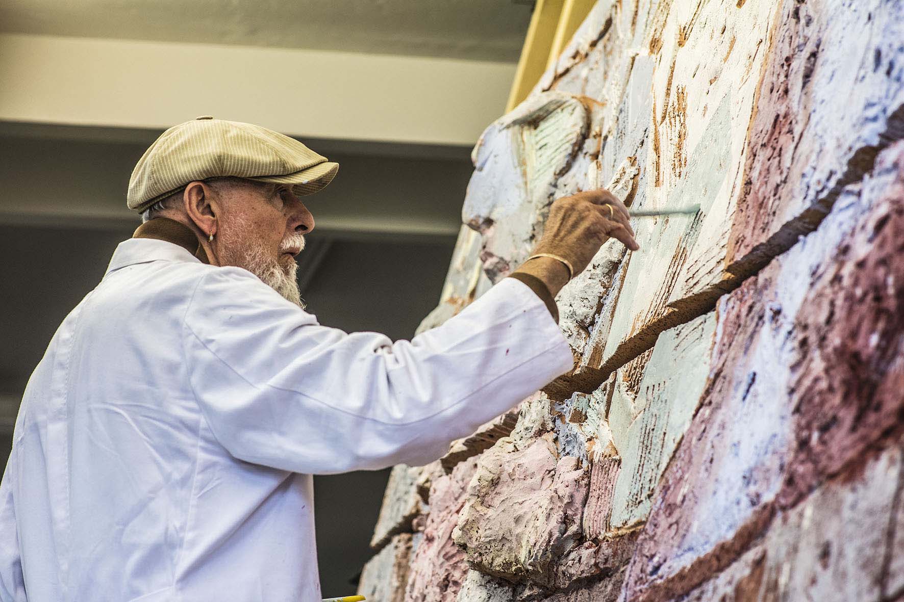 Markus Lüpertz hochmotiviert und mit voller Konzentration beim Relieffieren. Im feuchten Zustand haben die Bilder 2,2 mal 4,4 Meter Größe. Deshalb arbeitet er neben und auf dem Bild. Enorme Mengen an Ton müssen weggenommen und wieder aufmodelliert werden. Über 20 Tonnen Ton werden bearbeitet. Außergewöhnliche Kunst hält wohl jung und fit.