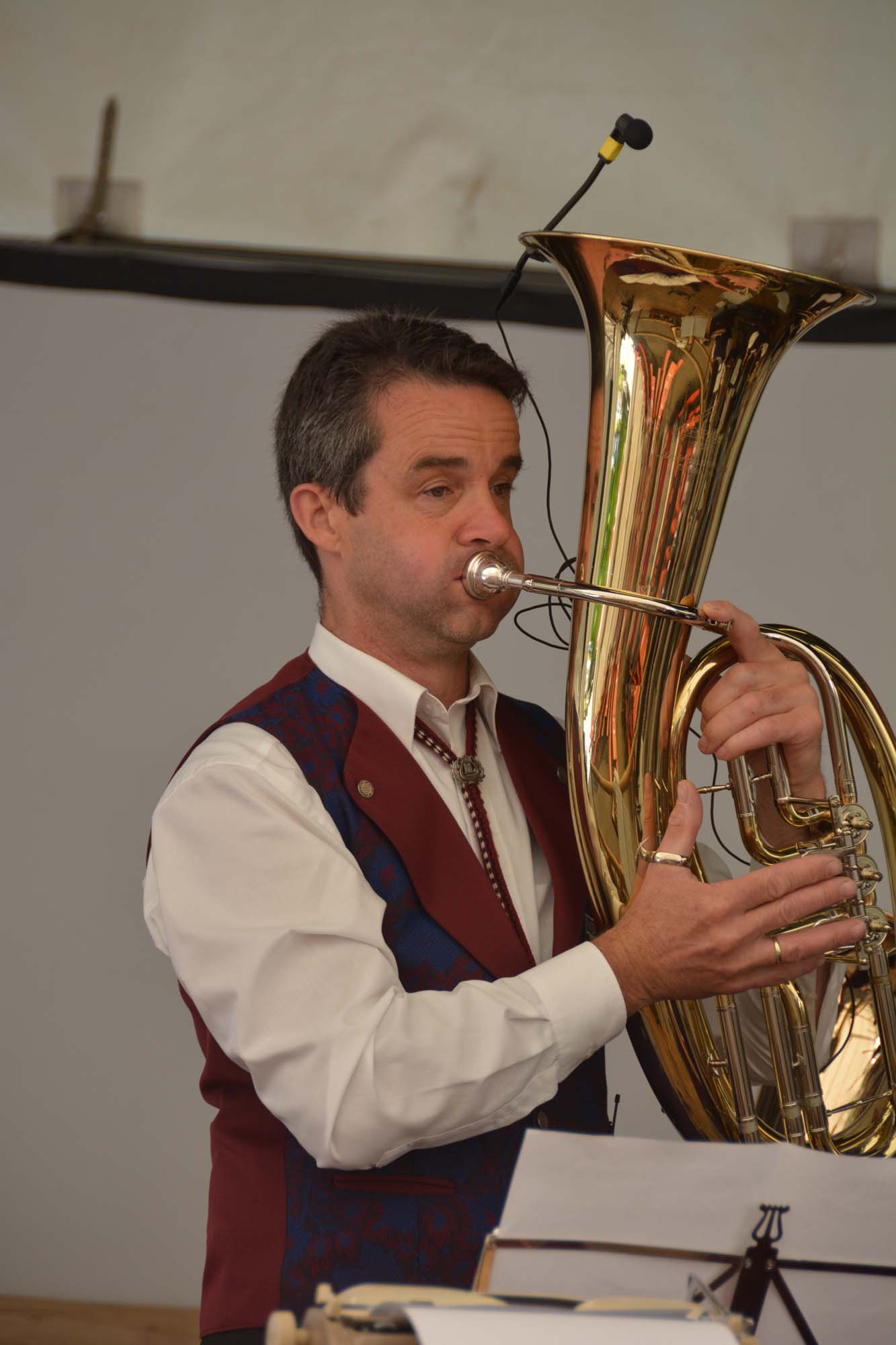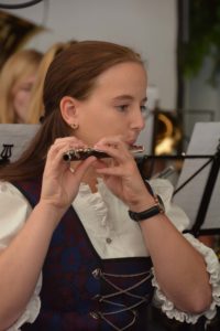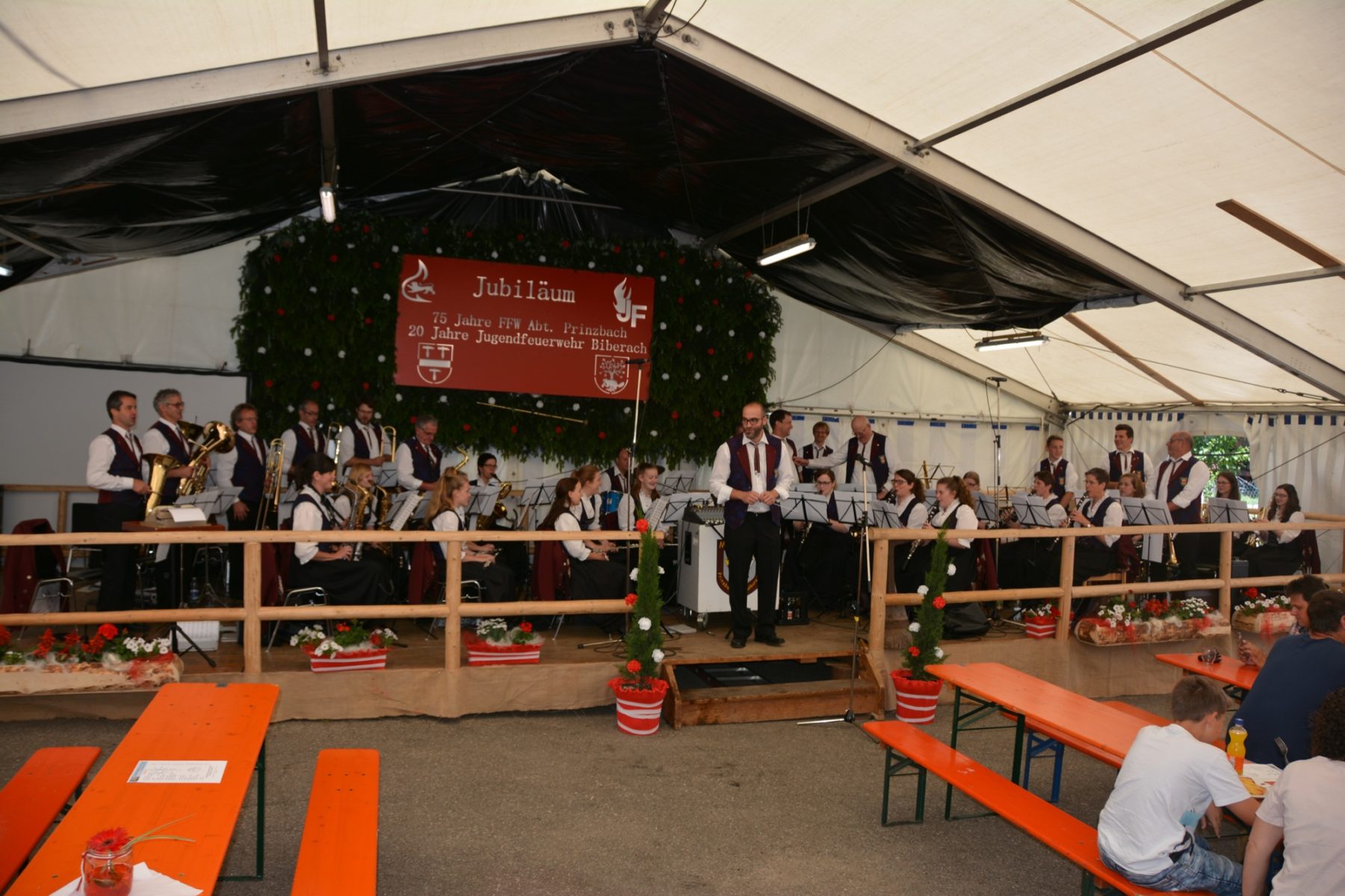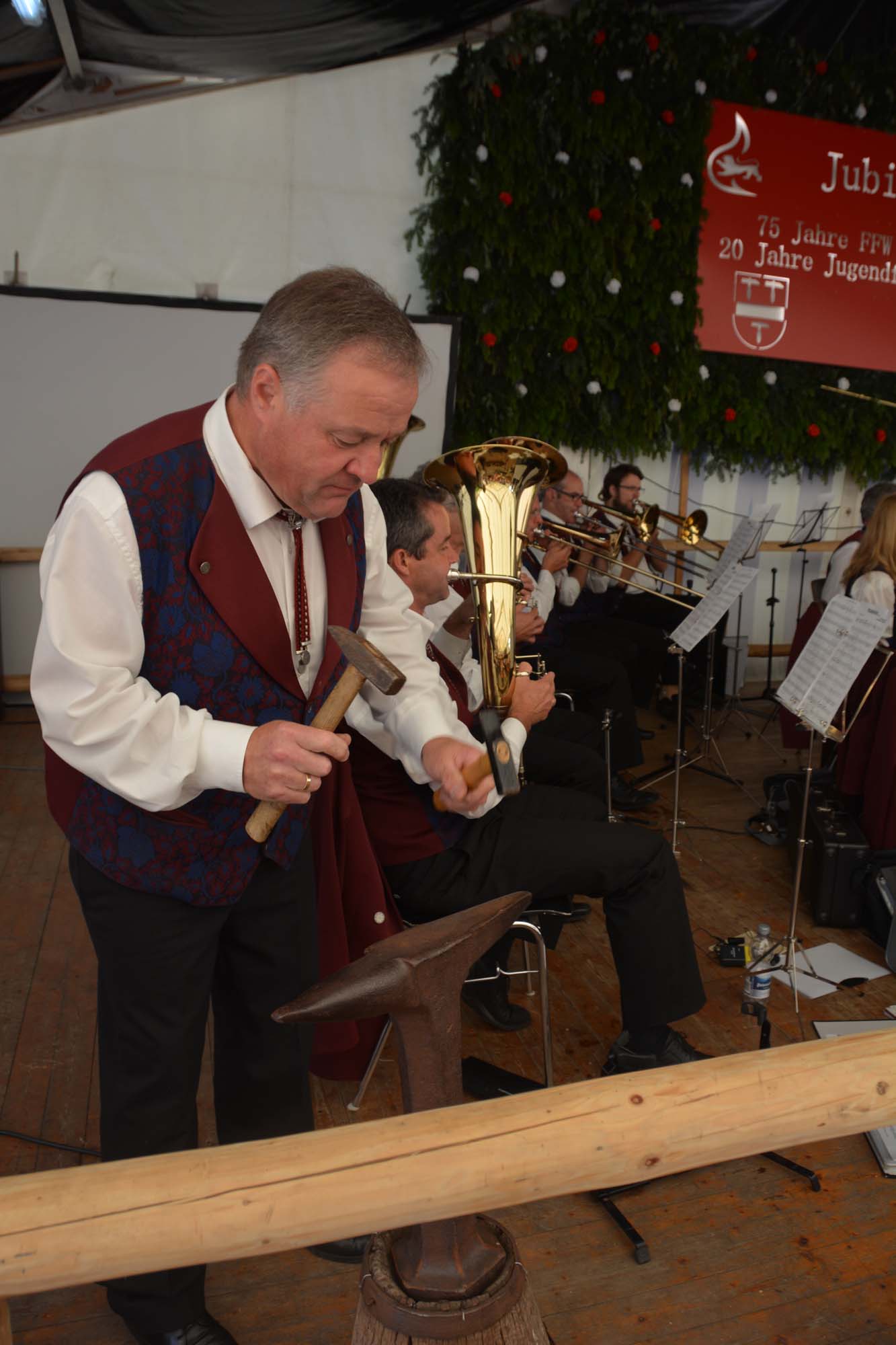 Nach dem Festgottesdienst zog es die Besucher in das Festzelt zum Frühschoppen. Die Musikkapelle Prinzbach-Schönberg unter der Leitung von Dirigent Stefan Griesbaum hatte für die beiden Jubiläumswehren einen bunten Strauß musikalischer Geburtstagsgeschenke mitgebracht. Passend zur Atmosphäre stimmten die Dorfmusikanten Marsch und Polka an und sorgten so zwei Stunden lang für beste Unterhaltung. Auch solistische Einlagen durften dabei nicht fehlen. Unter anderem glänzten bei dem Musikstück »Großvaters Uhr« Klaus Beck am Tenorhorn und Christine Volk an der Piccoloflöte im Dialog als Solisten. Bei der Polka »Feuerfest« sorgte Friedrich Roser am Amboss für den hell klingenden Rhythmus.