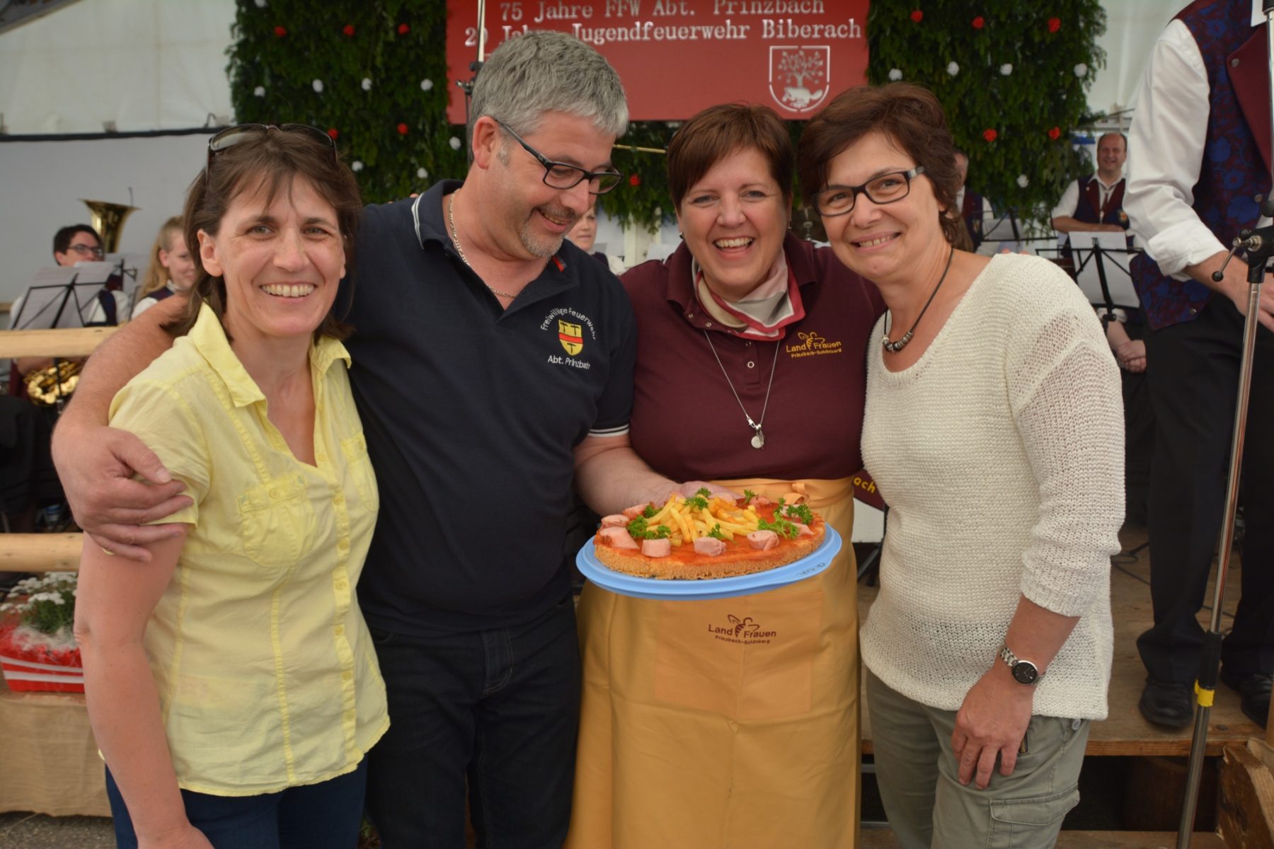 Im »Löscheinsatz« waren am Festsonntag die Feuerwehrkameraden aus Biberach, die die Bewirtung der Gäste übernommen hatten. Die Prinzbacher Landfrauen verwöhnten die Besucher mit ihren feinen, hausgemachten Kuchen. Eine besondere Torte hatten die Landfrauen für den frisch gebackenen Ehrenkommandanten Thomas Echtle kreiert. Aus den Händen von Christa Schmieder, Karin Roser und Gerlinde Echle durfte er eine »Currywurst-Torte« entgegennehmen. Und die Zusage, dass er ab sofort in den Kreis der Prinzbacher Landfrauen aufgenommen ist.