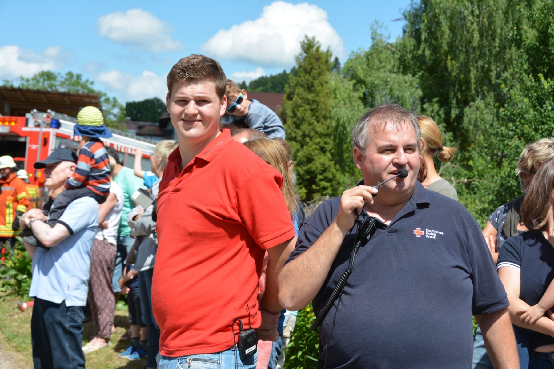 Am Nachmittag setzte dann Jugendwart Michael Weng von der Jugendfeuerwehr über die Telefon-Nummer 112 den Notruf ab: Im Bauernhof der Familie Berger ist ein Brand ausgebrochen. Dichte Rauchschwaden drangen aus dem Gebäude, die Sirene alarmierte die Einsatzkräfte und die Bevölkerung. Anschaulich erklärten Michael Weng und Thomas Leopold von der DRK-Ortsgruppe Biberach das weitere Szenario der Schauübung. Zwei Personen wurden im Stall durch herunterfallende, brennende Teile verletzt, zwei weitere Personen mussten vom Balkon gerettet werden. Außerdem mussten das große Hackschnitzellager und das Leibgedinghaus mit einer Riegelstellung vor den Flammen abgeschirmt werden.