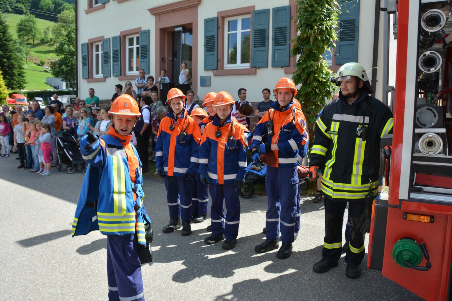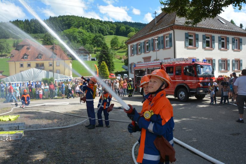 Am Ende der anschaulichen Übung gab es großen Applaus von den zahlreichen Zuschauern. Auch Gesamtkommandant Klaus Disch, der zu den interessierten Beobachtern zählte, hat viel Lob für den Feuerwehrnachwuchs parat. Und wie bei den Großen waren die Jugendfeuerwehrkameraden dann als Dank für ihren Einsatz von ihren Prinzbacher Kameraden zu einem gemeinsamen Essen ins Festzelt eingeladen. Dort nahmen am späten Nachmittag die »Geroldsecker Musikanten« auf der Bühne Platz und sorgten für einen unterhaltsamen Ausklang des Pfingstsonntags und des gelungenen Feuerwehr-Doppeljubiläums.
